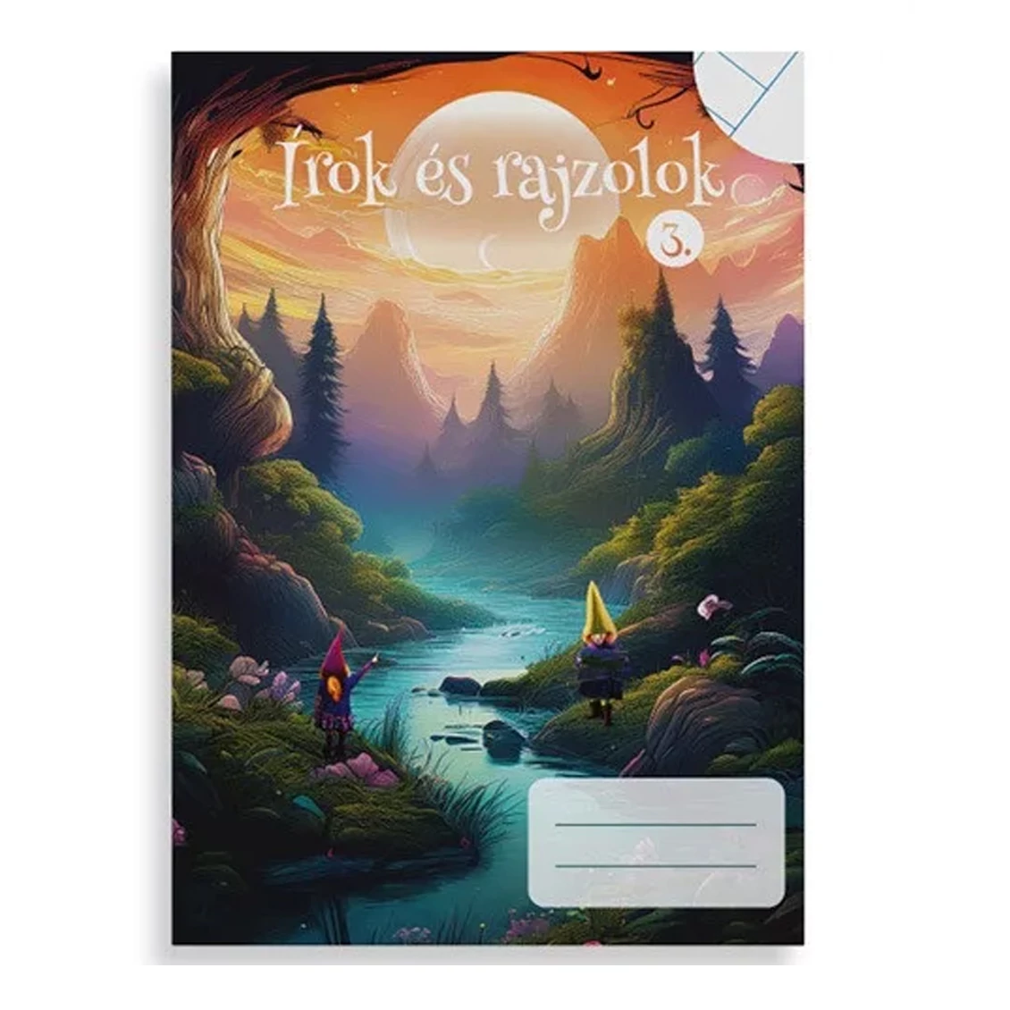 A mesebeli borító egy csodás alkonyi tájra repíti a gyerekeket, ahol kis manók barangolnak egy hegyi patak partján – ez a varázslatos látványvilág azonnal megragadja a figyelmet, és játékos hangulatot ad minden tanórának. A füzet belseje jól strukturált, a vonalas oldal segíti az íráskép rendezett kialakítását, míg a sima oldal teret ad a kreatív önkifejezésnek.