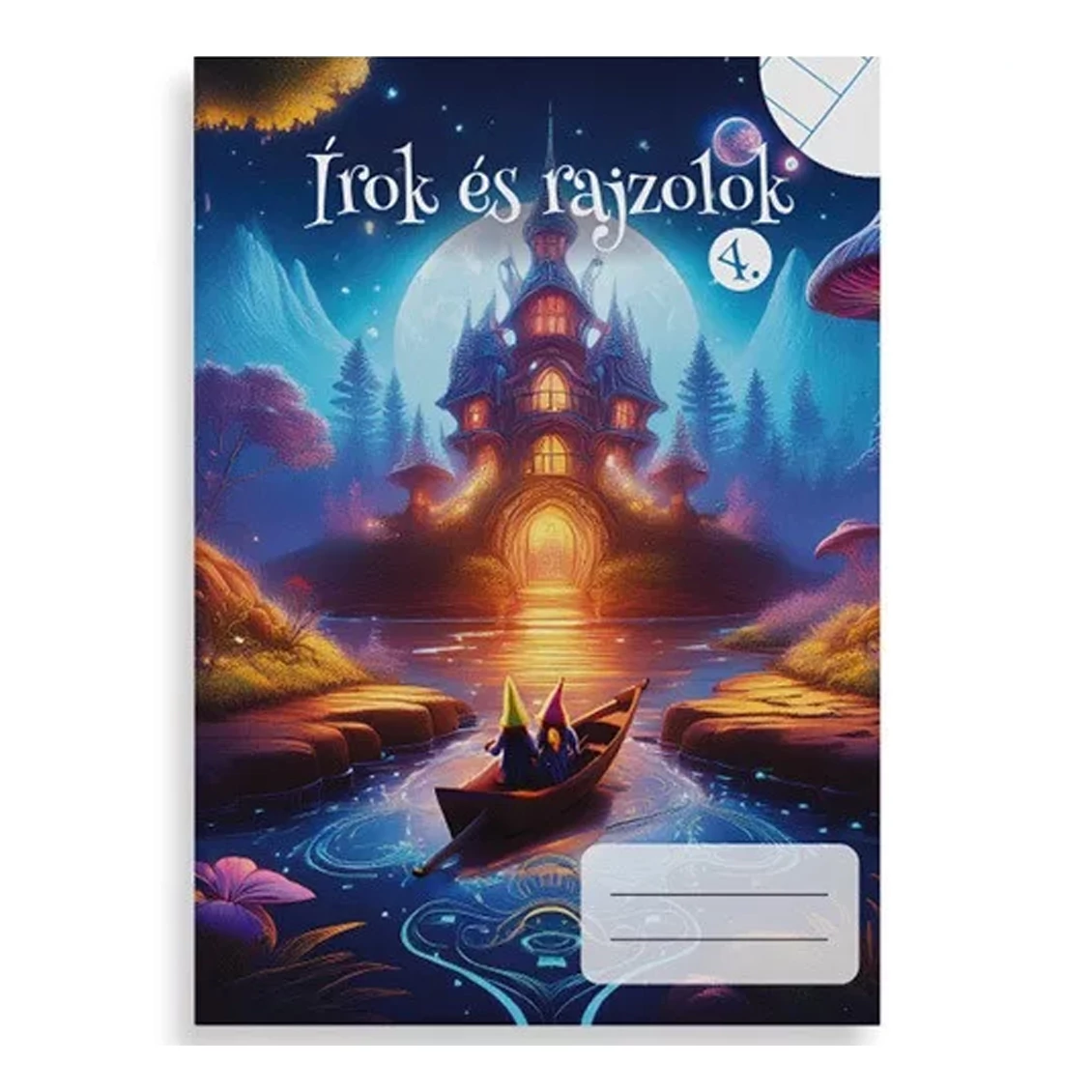A borító egy varázslatos mesevilágba repíti a gyerekeket, ahol két kis manócska csónakkal közelít egy fényárban úszó, titokzatos kastélyhoz. Ez a fantasztikus látvány nemcsak díszíti, hanem motiválja is a gyerekeket arra, hogy saját történeteiket is ilyen élménydúsan alkossák meg. A belső vonalazás 4. osztályos korosztálynak megfelelő kiosztású, segít a rendezett írásban, míg a sima oldal szabad teret ad az alkotásnak – legyen szó rajzról, ábráról vagy grafikus feladatokról.