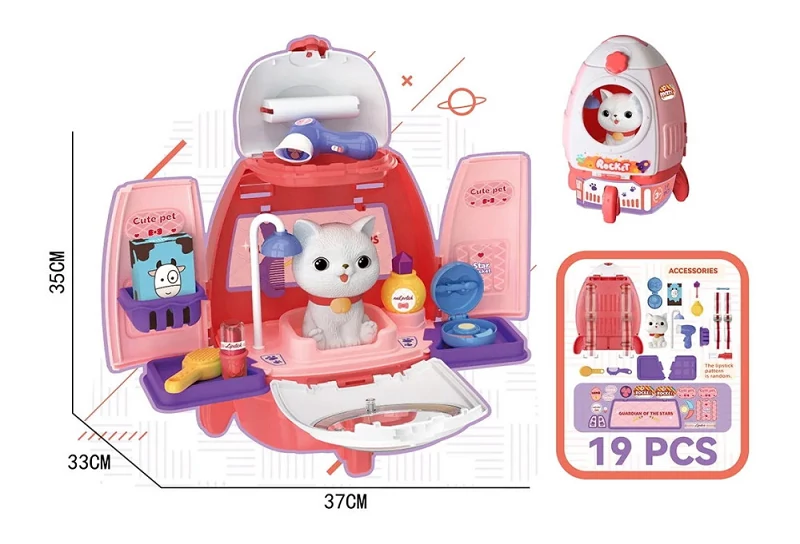 A gyerekek akik szeretik az állatokat igazán imádni fogják eme játékszettet. A 19 darabos szettben található kellékekkel a kicsik állatkozmetikai készségeiket gyakorolhatják egy imádni való szürke kiscicán. Megmosdathatják, megfésülhetik, megszáríthatják és ha igazán jól viselkedett a cicus, akkor meg is jutalmazhatják egy kis tejcsivel.