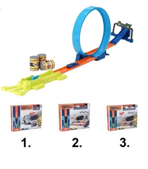 Versenypálya játékkészlet két egymás melletti versenypályával, 2 fém autóval és egy célzászlóval a végét jelző zászlóval. Pályahossz: 2x 97 centiméter. Alkalmas 6 éves és idősebb gyermekek számára.