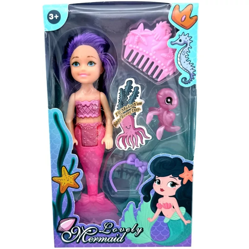 A Lovely Mermaid sellő baba játékszett egy varázslatos tengeri kalandra hívja a gyerekeket! A csomagolásban egy gyönyörű sellő baba található, aki csillogó farokuszonyával és színes hajával minden kisgyermeket elbűvöl. A szett különféle kiegészítőket is tartalmaz, mint egy fésű, hajpánt és apró tengeri figurák, így a játék még izgalmasabb és fantáziadúsabb lesz.