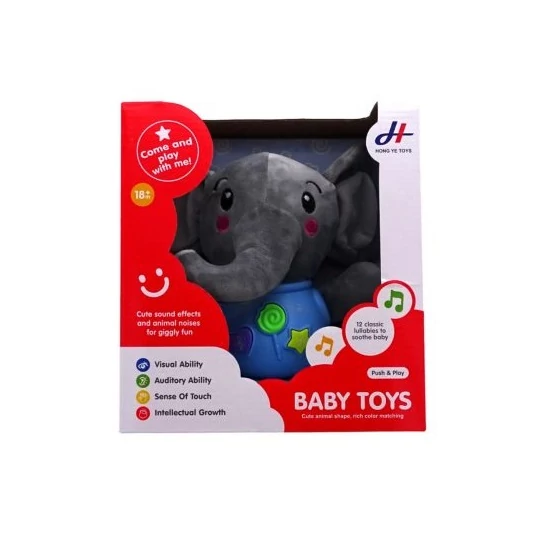 Fedezd fel a szeretet és a játék varázslatos világát ezzel a puha elefántos elemes baba játékkal, amely minden kis gyerek számára tökéletes társ! Ez a plüss játék elefánt rendkívül puha és szerethető, ideális ölelésekhez és kényelmes játékhoz. A plüssön található gombok lenyomásával az elefánt 12 különböző dallamot és 5 hangot tud kiadni magából, így a babák élvezhetik a zene és a hangok varázslatos világát. Ez a játék nemcsak szórakoztatja a babákat, hanem segíti a hallásuk fejlődését és a motoros készségeik fejlesztését is.