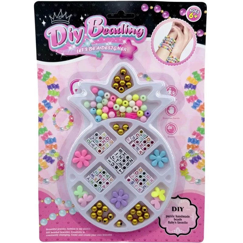 Ez a gyöngyfűző játékszett egy igazi kreatív kaland minden kis kézműves számára! A szettben különféle színes gyöngyök, aranyszínű díszek, betűs kockák és virágformák várják, hogy egyedi karkötőkké és nyakláncokká váljanak.