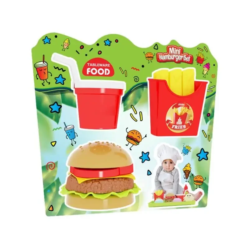 A gyerekek elkészíthetik saját hamburgereiket a Mini Hamburger játékkészlettel! Saját hamburgert készíthet úgy, hogy a hamburgerzsemle közé olyan darabokat helyez el, mint a játékparadicsom, sajt, zöldek. A gyerekek fejleszthetik fantáziájukat saját, élénk színekkel és valósághű részletekkel rendelkező hamburger játszókészletük megépítésével.