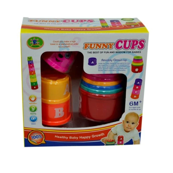 Építő játék gyerekeknek poharakból. A poharakon található betűkkel, számokkal megtanulhatják a számok és betűk helyes sorrendjét, ha a poharakat megfelelő nygaság szerinti sorrendben rakják egymásra.