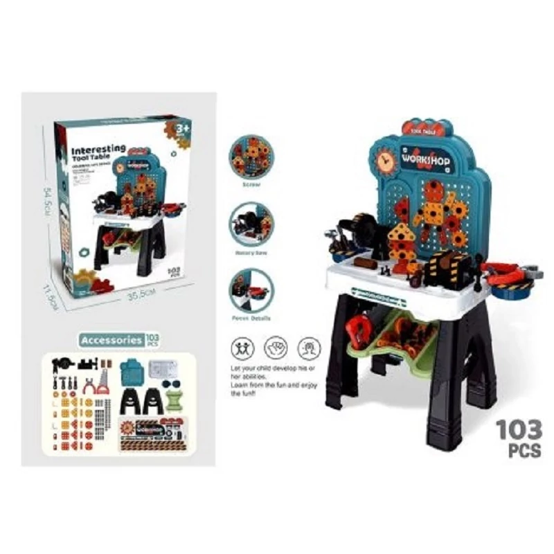 Az összerakható szerszámtartó asztal tökéletes hely a munkához, de a játék végeztével praktikus tárolóhelyként is szolgál az eszközöknek, megtanítva a gyerekeket a rendrakás fontosságára.