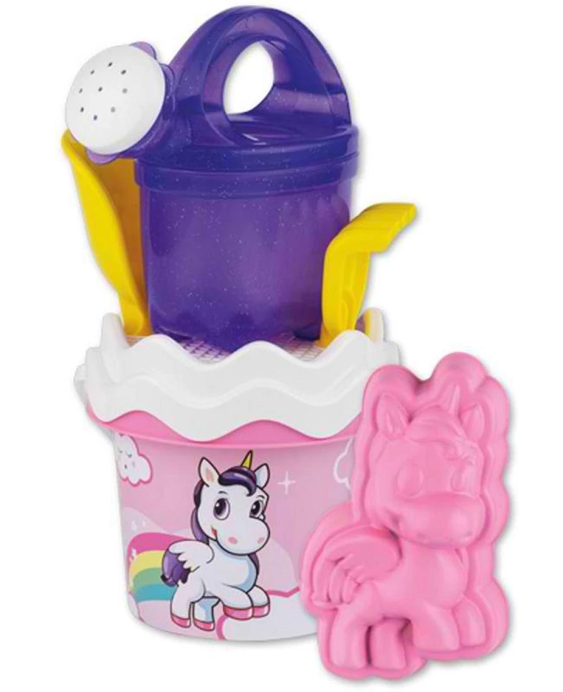 Remek minőségű homokozó szett, mely kislányok számára készült. Az unikornis homokozóforma mellett a gyönyörű állat feltűnik a kis vödör mintázatán is, továbbá a szett része a gereblye és a lapát is, amikkel azonnal kezdetét veheti a terep elrendezése a homokozóban. A locsolókannával vizet szállíthatnak az építéshez, a szitával pedig a rögöket vagy kavicsokat szűrhetik ki belőle.