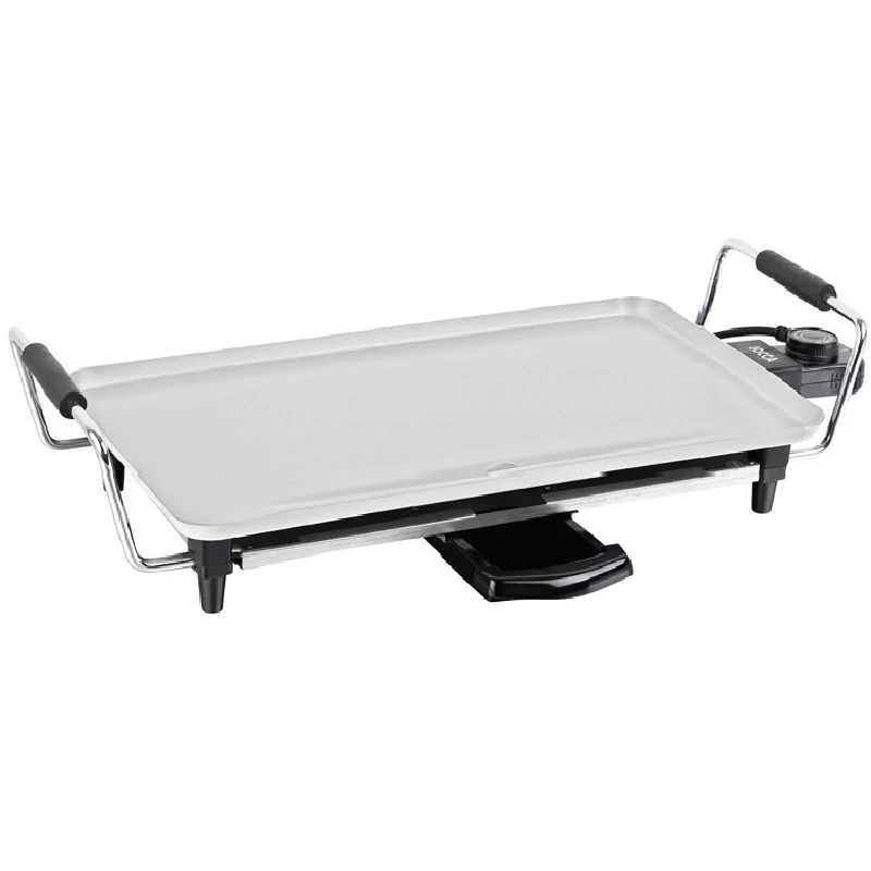 A hófehér felületű Jocca 5003C tapadásmentes kerámia sütőlap ideális húsok, halak, zöldségek, burgonya, palacsinták és sok más étel gyors, egészséges és természetes elkészítéséhez. Praktikus a konyhában, de nyáron nagyszerű az étkezőben, a kertben vagy a teraszon is. 2000 W teljesítményének köszönhetően kedvenc ételeit úgy készítheti el, hogy megőrzi azok ízét és textúráját. Levehető termosztáttal rendelkezik a hőmérséklet szabályozásához, és hideg tapintású fogantyúkkal, amelyek lehetővé teszik, hogy kényelmesen az asztalhoz vigye az ételt. Ha elkészült, könnyen tisztítható és tárolható.