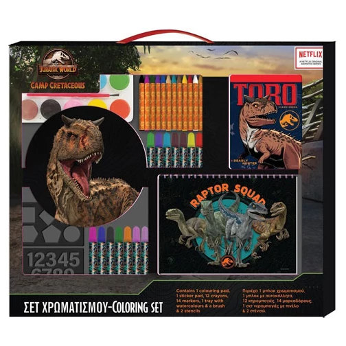 A legtöbb gyerek imád rajzolgatni és aszínezni, és most egy vagány Jurassic World: Krétakori tábor mesefilm legvagányabb dinoszauruszaival díszített készlettel kedveskedhetünk nekik. Ebben a csomagban a gyerekek mindent megtalálnak, amivel maguk is megrajzolhatják a kedvenc dinoszauruszukat. A csomag tartalmaz egy színezőt, amiben természetesen a Krétakori tábor dinoszauruszai mellett a mese többi szereplője is feltűnik, találhatnak benne a kis srácok egy vázlat füzetet amelyben a saját rajzaikat készíthetik el, és végül de nem utolsó sorban színes zsírkréták, filcek és vízfesték, valamint két sablon is a készlet része.