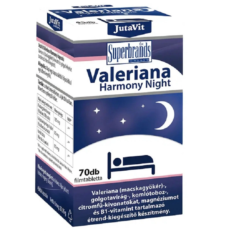 A Jutavit Valeriana Harmony Night 4 féle gyógynövény kivonatot, B1-vitamint és magnéziumot tartalmaz.