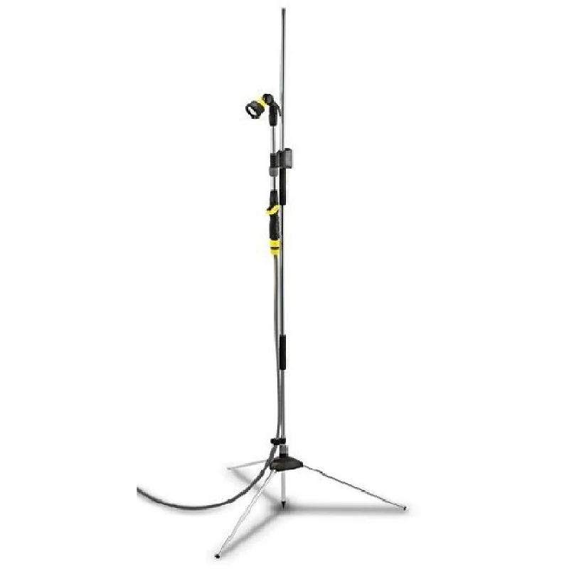 Termékismertető: A zuhany 3 perc alatt felépíthető. Három láb és egy leszúró tüske gondoskodik a stabilitásról. Állítható magasság 1,50 és 2,20 m között. Jellemzői: levehető zuhany- és öntözőrúd, széles zuhanysugár, az átfolyó vízmennyiség egy kézzel szabályozható, illetve be-/ki kapcsolható. 180°-ban elforgatható szórófej. Kényelmes és helytakarékos tárolás. Csatlakozási menet: G 3/4 és G 1.
