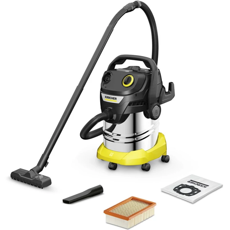 A KWD 5 S V-25/5/22 nedves és száraz porszívó fekete készülékkel kiváló szívóerőt biztosít, miközben energiatakarékos marad: A porszívó mindössze 1100 wattos energiafogyasztásával optimális tisztítási eredményeket ér el száraz, nedves, finom vagy durva szennyeződések esetén. A készülékhez robusztus, 25 literes rozsdamentes acéltartály, 5 méteres kábel, 2,2 méter hosszú szívótömlő, kapcsolható padlófúvóka, lapos pliszírozott szűrő és gyapjú szűrőzsák tartozik. A lapos pliszírozott szűrő különösen alkalmas non-stop nedves és száraz porszívózásra, a szűrő cseréje nélkül. A szabadalmaztatott szűrőeltávolítási technológiának köszönhetően a lapos pliszírozott szűrő másodpercek alatt eltávolítható, miközben elkerülhető a szennyeződéssel való érintkezés. Ha a szűrő elszennyeződött, a beépített szűrőtisztító funkcióval gyorsan és hatékonyan tisztítható. Az elektrosztatikus védelemmel ellátott levehető fogantyú lehetőséget biztosít különböző fúvókák közvetlen csatlakoztatására a szívótömlőhöz. Ez különösen előnyös a szűk helyiségekben történő porszívózásnál. A szívótömlő a helytakarékos tárolás érdekében biztonságosan felakasztható a készülékfejre. A lökhárítón lévő parkolóhely lehetővé teszi a csövek és a padlófúvóka gyors és kényelmes tárolását, ha rövid szünetet tart a munkában.