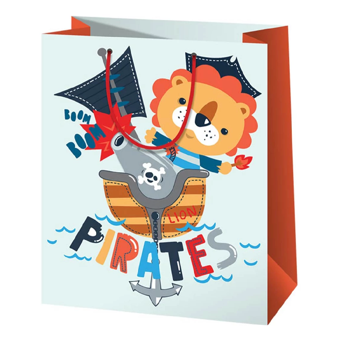 Éljen az erős oroszlán kalózoknak szentelt ajándéktáskával! Ezen közepes méretű, 18x23x10 cm-es táska azonnal elvarázsolja majd az ünneplőt. A táska külsejét egy merész oroszlán kalóz díszíti, aki biztosan mosolyt csal a megajándékozott arcára. A táskát kiváló minőségű, fényes laminált papírból készítették, amely nem csak kiválóan mutat, hanem tartóssága is garantált. Az erősített talprésznek köszönhetően nem kell aggódni, hogy a táska könnyen megsérül vagy összeroppan, akkor sem, ha nehezebb ajándékokat szállítunk benne. A táska erős szalag fülekkel is rendelkezik, amelyek nem csak a könnyű szállítást segítik elő, de további dizájn elemként is hozzájárulnak a táska különleges megjelenéséhez.