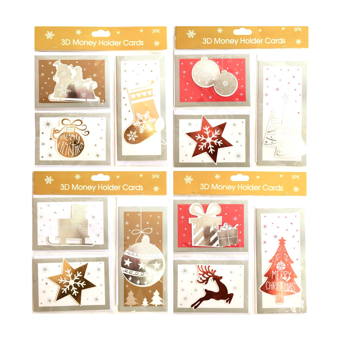 A Karácsonyi üdvözlő kártya szett borítékkal négy varázslatos változatban érhető el, kétféle színvilágban ( arany és piros) és tökéletes választás az ünnepi jókívánságok kifejezésére. Minden változat esetében az arany és fehér vagy piros és fehér színekkel kiegészített 3D-s elemek gondoskodnak arról, hogy a kártyák különlegesek és stílusosak legyenek. Minden csomag 3 db üdvözlő kártyát és hozzájuk tartozó borítékot tartalmaz.