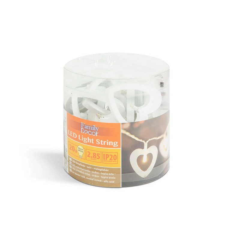 Dekorálja otthonát, irodáját szívecskékkel díszített fényfüzérrel. A melegfehér LED-ek megvilágítják a szívek belsejét, így otthonában minden irányból csodálatos vizuális élményt nyújt. A LED fényforrás alacsony energiafelhasználása miatt, elemmel is sokáig üzemeltethető.