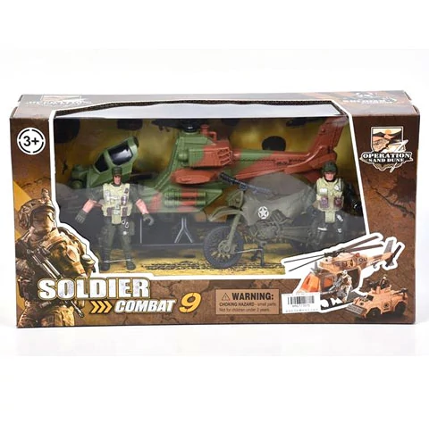 Gyermeked rajong a különleges katonai járművekért? Most egy különleges szettet szerezhetsz be számára, mely biztosan tetszeni fog majd neki. A szettben egy katonai helikopter és egy katonai, terep zöld színű motor található. Ezek mindegyike részletes kialakítást kapott, így nagyon élethű megjelenést nyújtanak. A szetthez két katona is tartozik, melyek tökéletesen passzolnak a járművekbe. A szett rengeteg játék lehetőséget nyújt gyermekednek, szerezd be őket és kezdődhet is a játék.