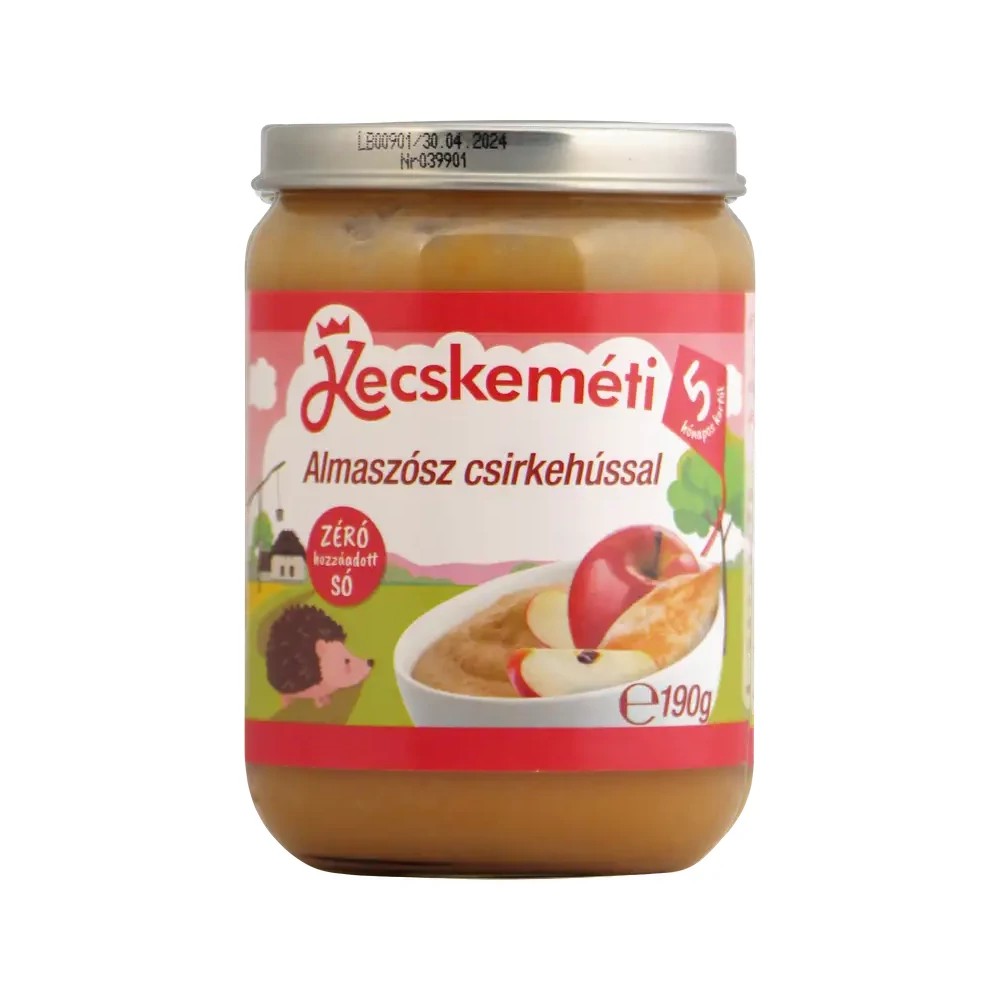 - Almapüré csirkehússal. Az 5 hónapos kortól javasolt Kecskeméti Menü fedezi a baba megnövekedett fehérjeszükségletét, biztosítja a vérképzéshez nélkülözhetetlen vasat, komplett főétkezést biztosítanak a baba számára. Menüinket omega-3 zsírsavakat tartalmazó repceolajjal egészítettük ki.