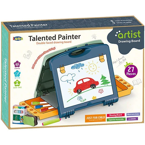 A kreatív gyerekek számára remek választás ez a kétoldalú rajztábla, amivel szabadon alkothatnak, és pillanatok alatt alakíthatnak ki bárhol egy rajzstúdiót. A készlet egy fogantyúval ellátott műanyag táskában kapott helyet, amit azonban egyetlen mozdulattal szét lehet kinyitni, és akár álló állapotban is lehet rögzíteni. A doboz belsejében olyan hasznos apróságok kerültek, mint a letörölhető színes filcek, szivacs és a tábla hátulján kialakított Kígyók és létrák társasjátékhoz szükséges figurák és dobókocka.