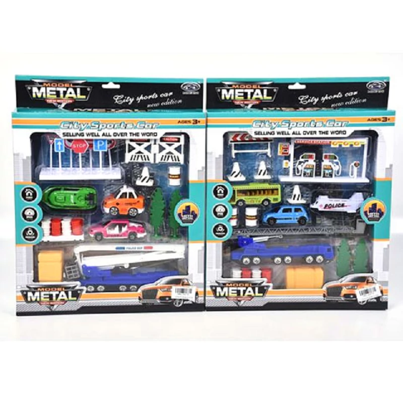 A szettben különböző járművek találhatóak meg mint például busz, autó, kamionos daru, hajó vagy helikopter.