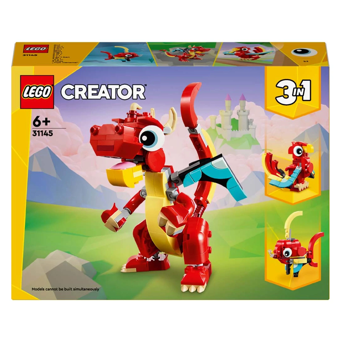 A 6 éves vagy annál nagyobb gyerekek egy varázslatos vidékre utazhatnak a vidámsággal teli történetekért ezzel a 3 az 1-ben Vörös sárkány (31145) állatos építőszettel. Egy barátságos játék sárkányt tartalmaz: nagy szemei és beállítható karja, keze, szárnya, lába, lábfeje és szája van; így a gyerekek eldönthetik, hogy milyen kalandokra indulnak a játékidőben, és hogy után miként állítják ki a modellt.