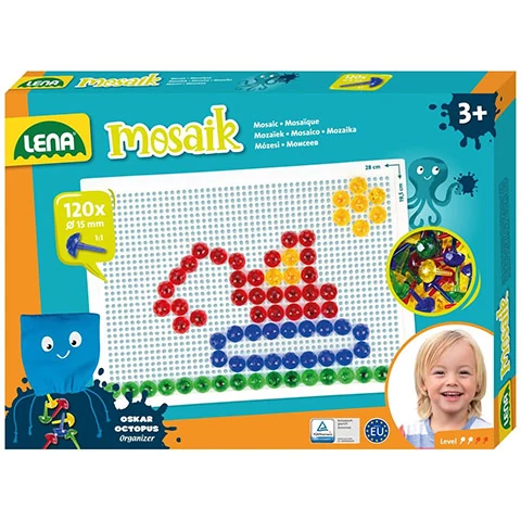 A Mosaik egy egyszerű játék, viszont szórakoztató mindenki számára. Készségfejlesztő hatással van a kisgyerekekre ugyanis különböző kisebb, nagyobb alakzatokat alkothatnak a pötyik segítségével, amelyeket a tábla lyukas részeibe kell beilleszteni. A mozaikkép jó kihívás, tartalmas tevékenység amihez türelem kell, de a végén sikerélményt hoz és a kézügyességet is remekül fejleszti. A pötyik négy színűek, így különböző módon lehet rakosgatni őket.