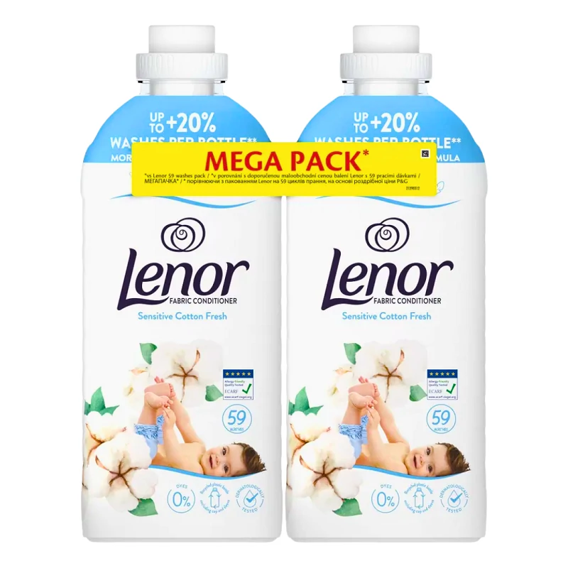 A Lenor Sensitive Cotton Fresh hipoallergén textilöblítő enyhe pamutillatot és mennyei puhaságot kölcsönöz a ruháknak. A formula érzékeny bőrűek számára készült, bőrgyógyászatilag tesztelt (mosott textíliákkal érintkező bőrön végzett vizsgálat), és rendelkezik az ECARF Európai Allergiakutató Alapítvány tanúsítványával.