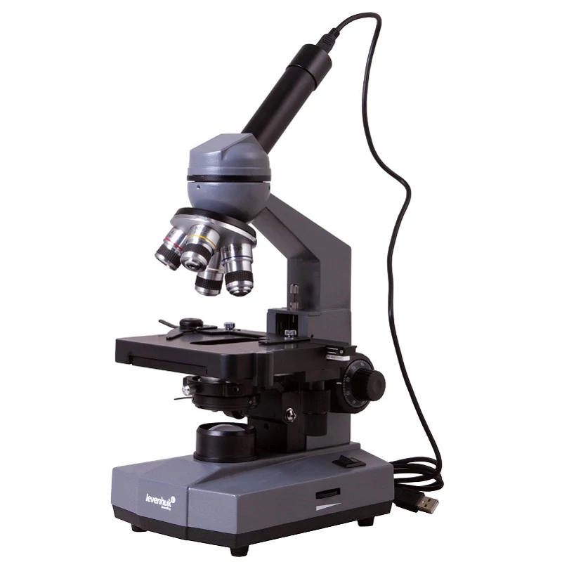 A Levenhuk D320L BASE egy 360°-ban forgatható fejrésszel felszerelt monokuláris mikroszkóp. A megfigyelésekhez egy széles látószögű 10x szemlencse és négy darab, különböző nagyítási fokú akromatikus objektív áll rendelkezésre. A nagyítás foka 40x és 1000x között változtatható. Maximum nagyítás mellett (100x-os objektív használatakor) olajimmerzió alkalmazható. A készletben egy üveg immerziós olaj található.