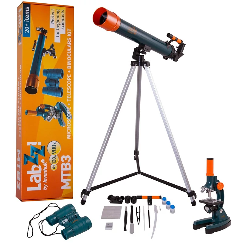 A Levenhuk LabZZ MTВ3 készlet igazi gyöngyszem a kíváncsi gyerekek szüleinek. A készletben található egy mikroszkóp, egy teleszkóp és egy távcső. Mindegyik eszköz kifejezetten fiatalok számára készült, és számos kiegészítő teszi teljessé. A készletben található eszközökkel a gyermeked számos csodás felfedezést tehet: a mikroszkóp segítségével tanulmányozhatja a szabad szemmel láthatatlan világot, felfedezheti a kozmoszt a teleszkóppal, és megfigyelheti a madarakat és állatokat a távcsővel.