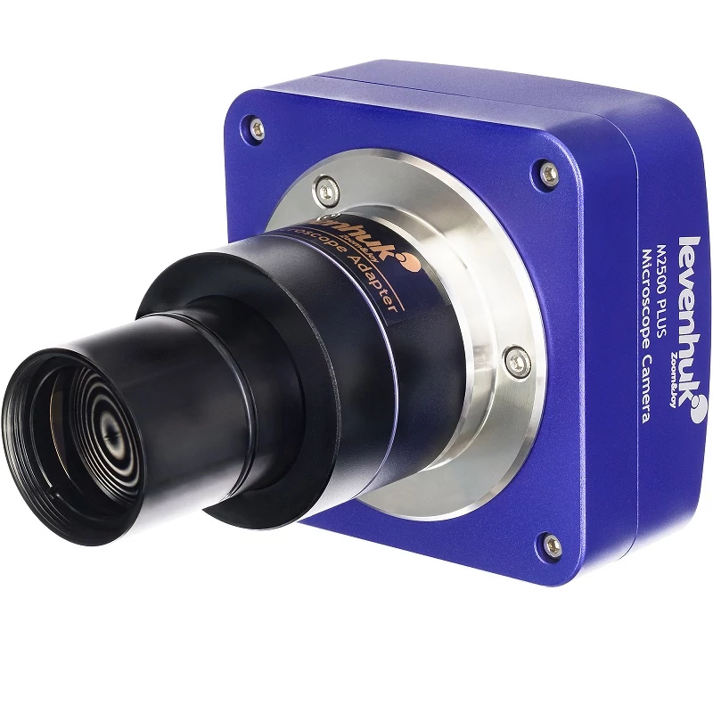 A Levenhuk M2500 PLUS digitális kamerát nagy felbontású képek rögzítésére terveztük, 4x és 10x nagyítású objektívekkel használva. A kamera 25 MP-es érzékelője még kisebb nagyítás mellett is lehetővé teszi a megfigyelt kép számos finom részletének tanulmányozását. Az érzékelő max. 4928x4928-as felbontású színes képet készít. A kamera használatát a világos látóterű kutatási módszerhez ajánljuk.