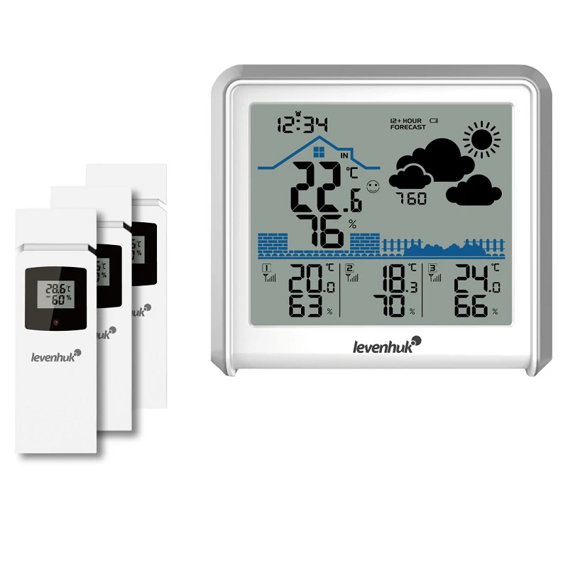 Levenhuk Wezzer PLUS LP50 – többcsatornás időjárás-állomás, amely egyszerre négy helyen képes mérni a hőmérsékletet és a páratartalmat. Az alapállomáshoz három darab távoli érzékelő tartozik, amelyeket különböző szobákban vagy kültéren lehet elhelyezni. Az időjárás-állomás vidéken tudja igazán a hasznosságát bizonyítani, ahol elengedhetetlen a meteorológiai adatok ellenőrzése a termények tárolóhelyeinél és a melléképületekben. Jó szolgálatot tud tenni egy tágas lakásban vagy irodában is.