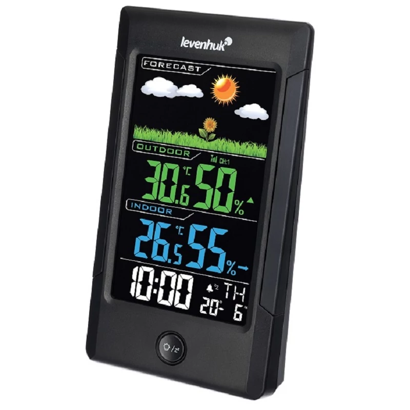 A Levenhuk Wezzer Teo TH40 hőmérséklet- és páratartalom-mérő készülék bármelyik otthon és iroda stílusos eszköze. Kontrasztos, hátsó megvilágítású, színes kijelzővel rendelkezik, és vezeték nélküli hő- és páratartalom-érzékelővel van felszerelve, amelyet a fő egységtől akár 80 méteres távolságban is el lehet helyezni. A hőmérséklet és a páratartalom mérése mellett a berendezés az időt, a hét napját, az időjárási trendet és az időjárási előrejelzést is kijelzi. Ébresztőóra is található benne, szundi funkcióval.