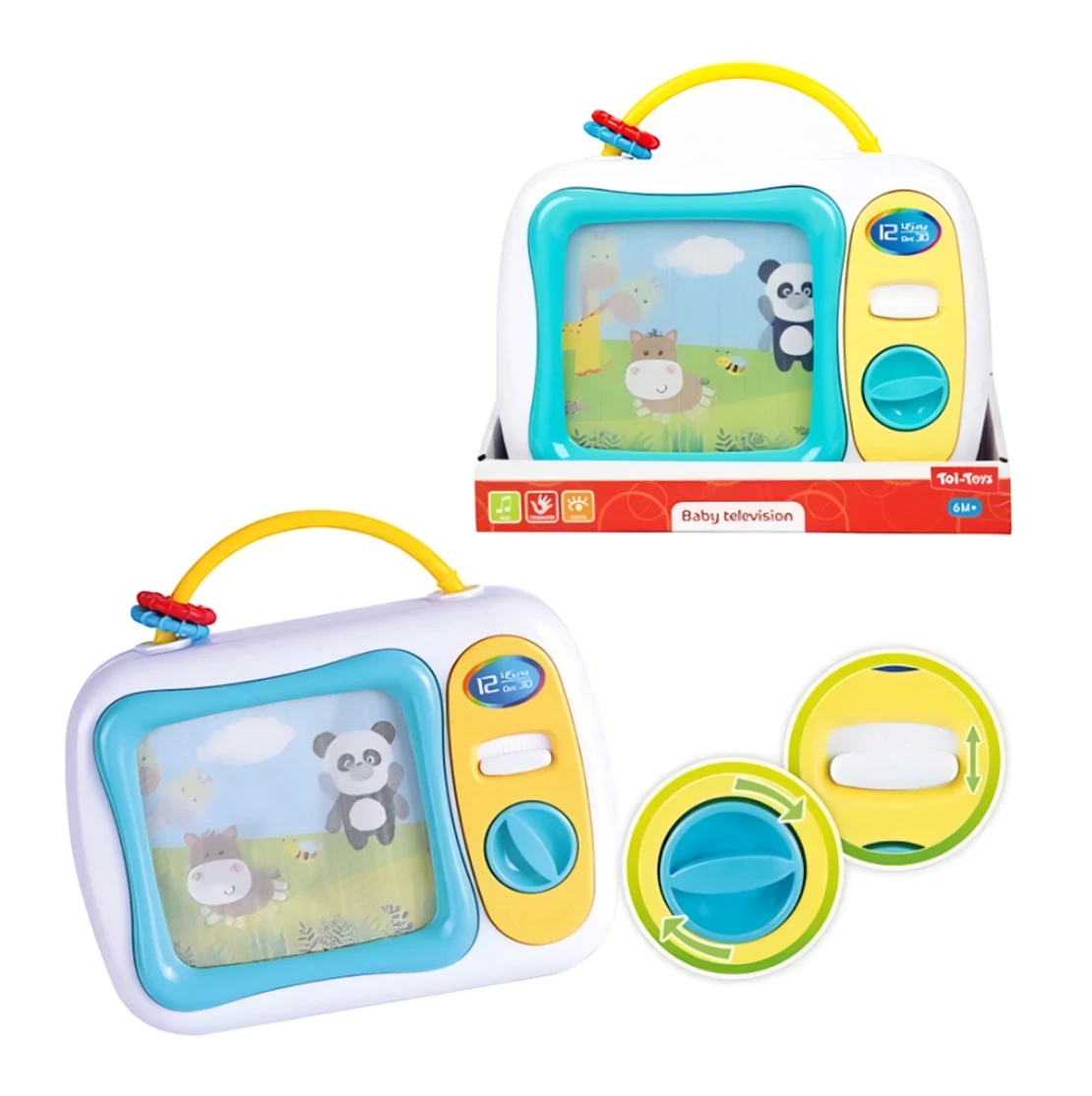A bébi tv beépített csörgőjével minden forgatás és mozgás kellemes, lágy hangokat ad ki, ami fejleszti a baba hallását és segít neki megérteni az ok-okozati összefüggéseket. A színes gombok és az élénk kijelzők figyelemfelkeltőek, így segítenek a vizuális észlelés fejlesztésében is. A játék tetején található fogantyú megkönnyíti a baba számára a játék hordozását, így akár az egész nap vele lehet.