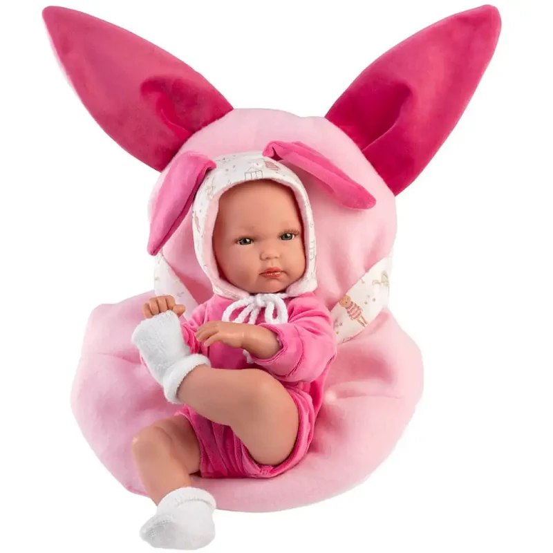 Llorens: Bimba újszülött baba rózsaszín nyuszis hordozóval 35cm