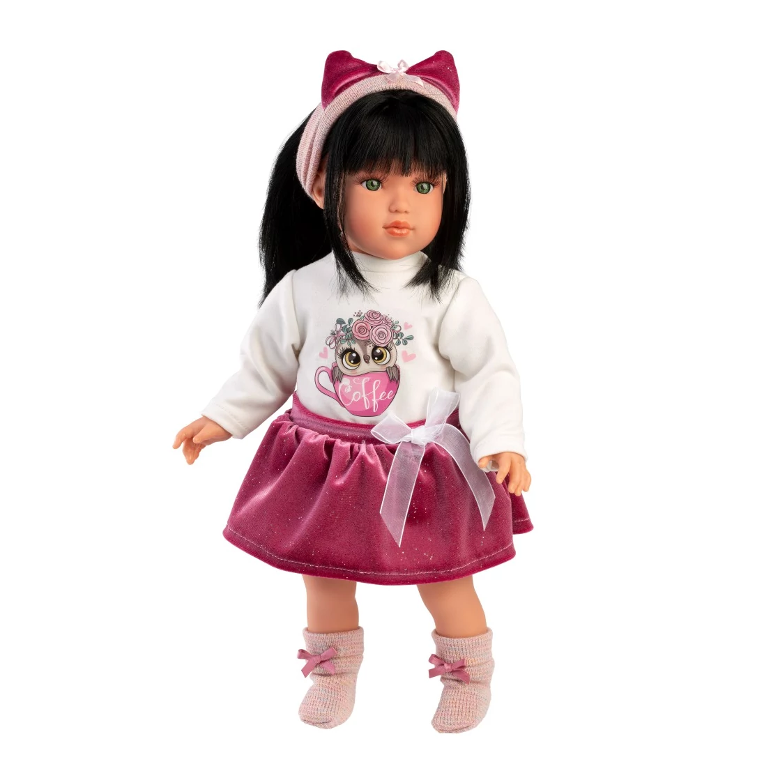 Találkozz Grétával, a Llorens 40 cm-es babájával, aki magával ragadó egyéniségével azonnal belopja magát a gyermeked szívébe! Gréta élethű megjelenése és megnyerő zöld szemei mellett egy stílusos bagoly mintás felsőt és csillogó rózsaszín szoknyát visel, ami mindig trendi választás a babák világában. A kiegészítők, mint a szalagos hajpánt és a cuki, csillogó cipők, tovább fokozzák elegáns megjelenését. Gréta hosszú, selymes fekete haja pedig bármilyen frizura elkészítésére alkalmas, így a gyerekek órákat tölthetnek el a kreatív és divatos hajrendezéssel. A Llorens prémium minőségű spanyol babák mindegyike kézzel készített, kiemelkedően részletgazdag kidolgozással bír és gondosan kiválasztott alapanyagok felhasználásával készül, hogy a legmagasabb minőségi követelményeknek is megfeleljen. A baba egy csodaszép díszdobozban érkezik, így gyerekeknek és gyűjtőknek egyaránt tökéletes választás.