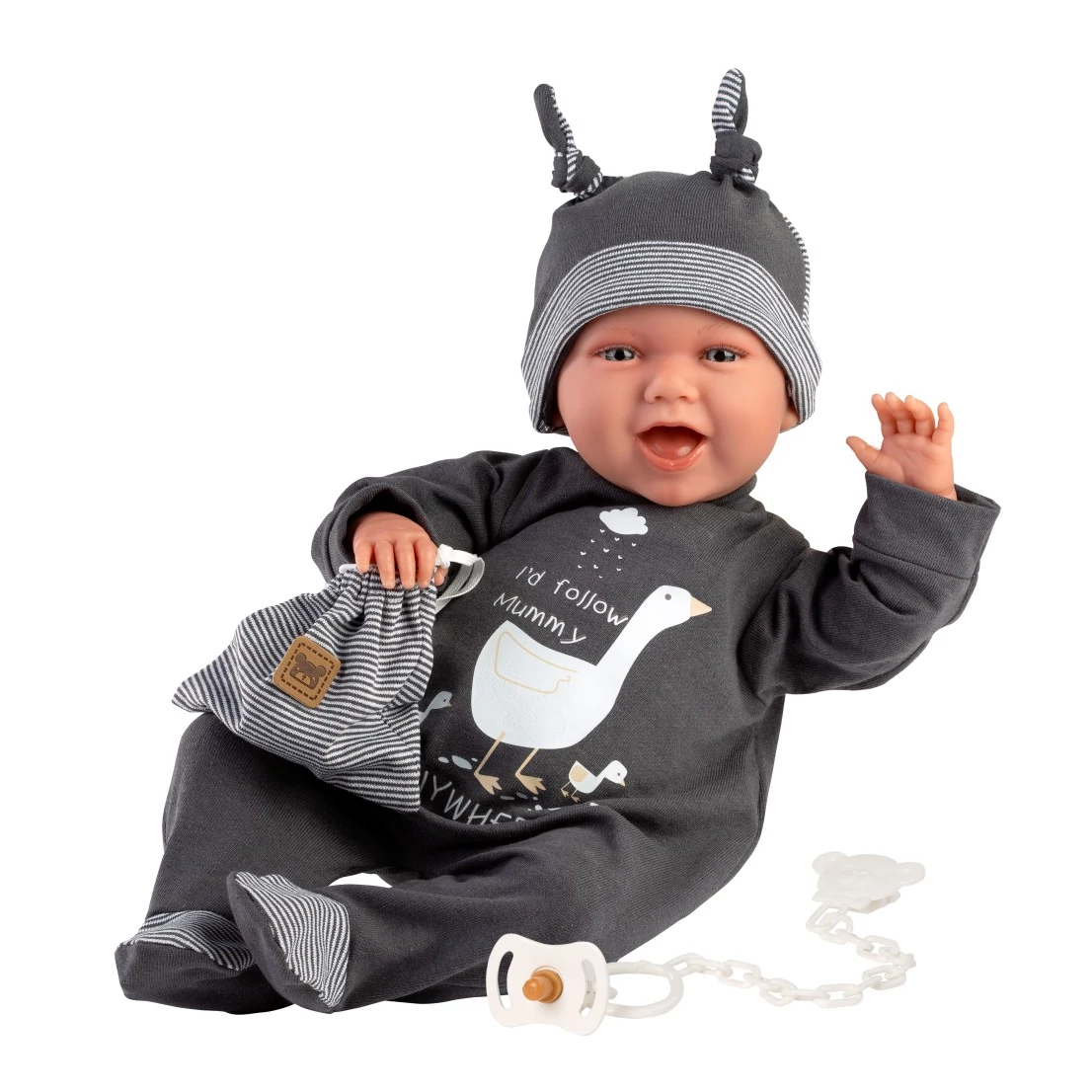 Itt van Mimo, a Llorens család legújabb tagja, egy 42 cm-es kis csibész, aki hangjával és megnyerő mosolyával hódítja meg a gyerekszíveket! Ez a baba olyan, mint egy igazi kis pajtás, akivel a nap minden percét szívesen töltik a kicsik. Fekete, libás pizsamájában nem csak aranyos, de kényelmes is, így készen áll a nappali játékra és az éjszakai álmodozásra egyaránt. Mimo puha testű kialakítása tökéletes az ölelgetéshez, a beépített hangfunkcióval pedig még élethűbb játékélményt nyújt. A kis sapkájával, ami két bojtban végződik, még vagányabb a kinézete, míg a cumilánc és a cumisüveg azokat a kiegészítőket jelenti, amelyekkel gyermeked igazán gondoskodóvá válik. Mimo a szórakozás és a szeretet elengedhetetlen kelléke minden gyermekszobában. A Llorens prémium minőségű spanyol babák mindegyike kézzel készített, kiemelkedően részletgazdag kidolgozással bír és gondosan kiválasztott alapanyagok felhasználásával készül, hogy a legmagasabb minőségi követelményeknek is megfeleljen. A baba egy csodaszép díszdobozban érkezik, így gyerekeknek és gyűjtőknek egyaránt tökéletes választás.