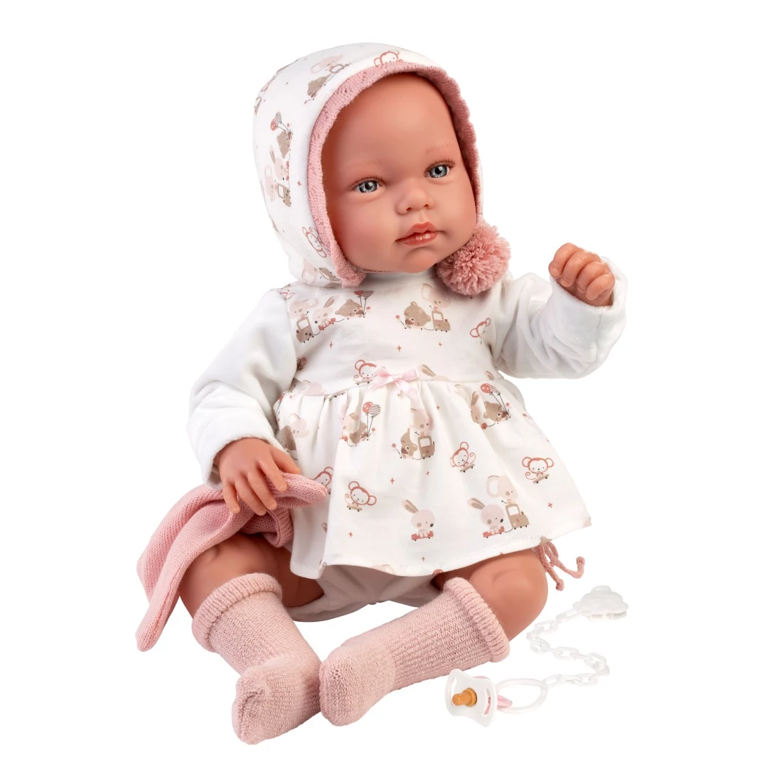 Llorens: Tala Llorana 44cm-es újszülött baba hanggal kapucnis ruhában