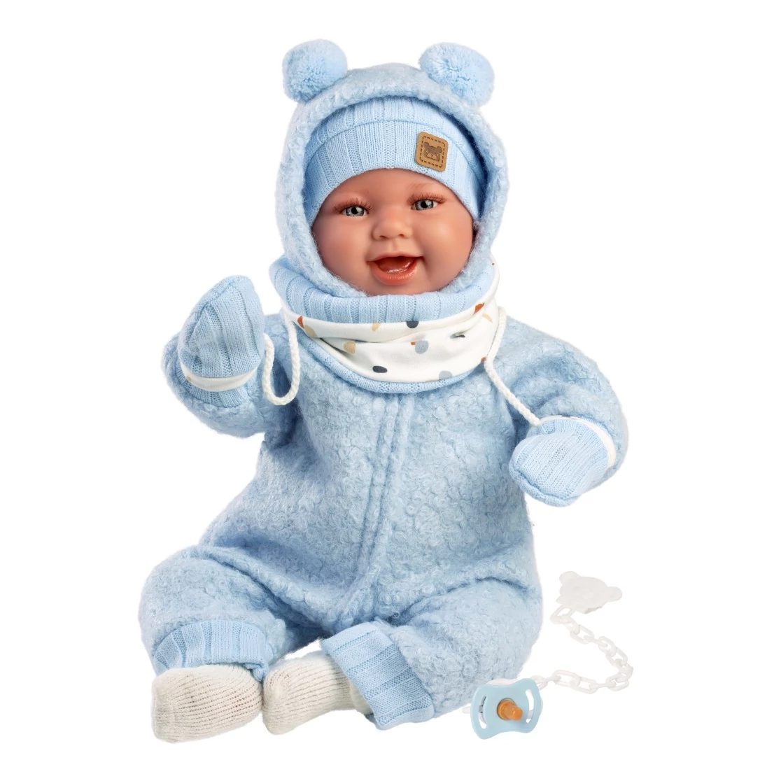Llorens: Talo Sonrisas 44cm-es újszülött baba hanggal kék kapucnis ruhában