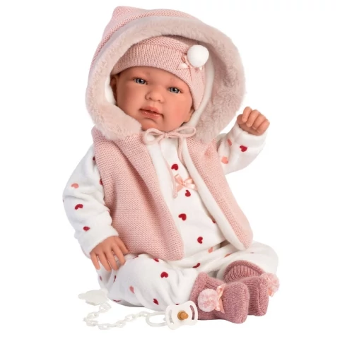 Llorens: Tina 44cm-es síró baba kapucnis rózsaszín mellényben (84440)