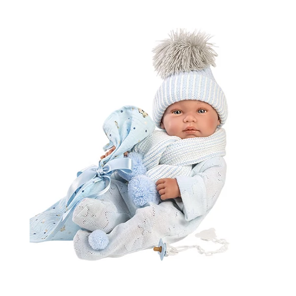 Llorens: Tino 43cm-es újszülött fiú baba kék babapléddel, cumival és 3db különböző ruhával