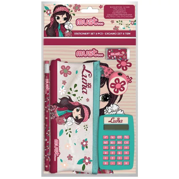 Luna: 6db-os lányos írószer szett tolltartóval, számológéppel és írószerekkel