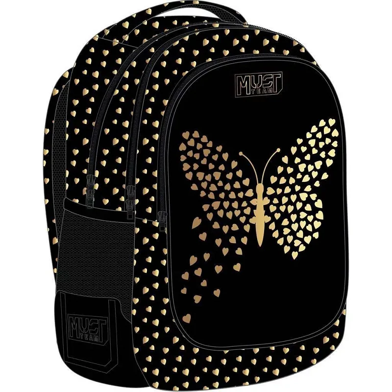 Stílusos, egyedi és praktikus – ez a Luna: Must hátizsák lekerekített 3 rekeszes pillangós változata, ami igazi kedvence lesz minden divatérzékeny iskolás lánynak. A fekete alapszín eleganciáját gyönyörű arany színű szívecskékből kirajzolódó pillangóminta dobja fel, amely modern és különleges megjelenést kölcsönöz a táskának. Nemcsak szép, de rendkívül jól használható is az iskolai mindennapokban.