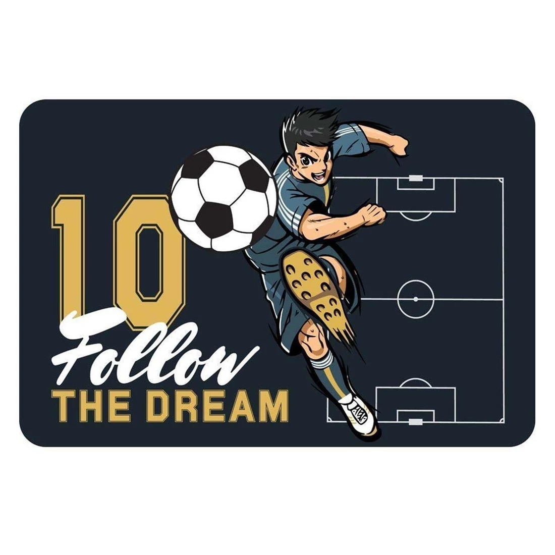 A sötét háttéren megjelenő lendületes focijátékos, a "10 Follow the Dream" felirat és a pályarajz egy sportos világba repíti a gyerekeket. Ez nem csak egy íróasztali alátét – ez egy inspiráló eszköz, ami segíthet abban, hogy a tanulás is olyan lendületes legyen, mint egy gólhelyzet a pályán!