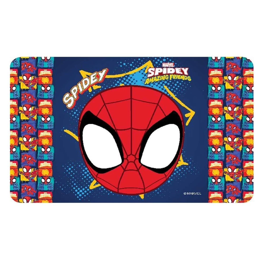 A könyöklő középpontjában Spidey ikonikus arca látható, nagy fehér szemekkel, a háttérben élénk kék alapon sárga grafikai elemekkel. A szélén ismétlődő, színes képregényszerű motívumok teszik még izgalmasabbá a dizájnt. Ez a strapabíró, könnyen tisztítható könyöklő segít abban, hogy a tanulás szórakoztatóbb és inspirálóbb legyen, főleg egy Spidey-rajongó számára.