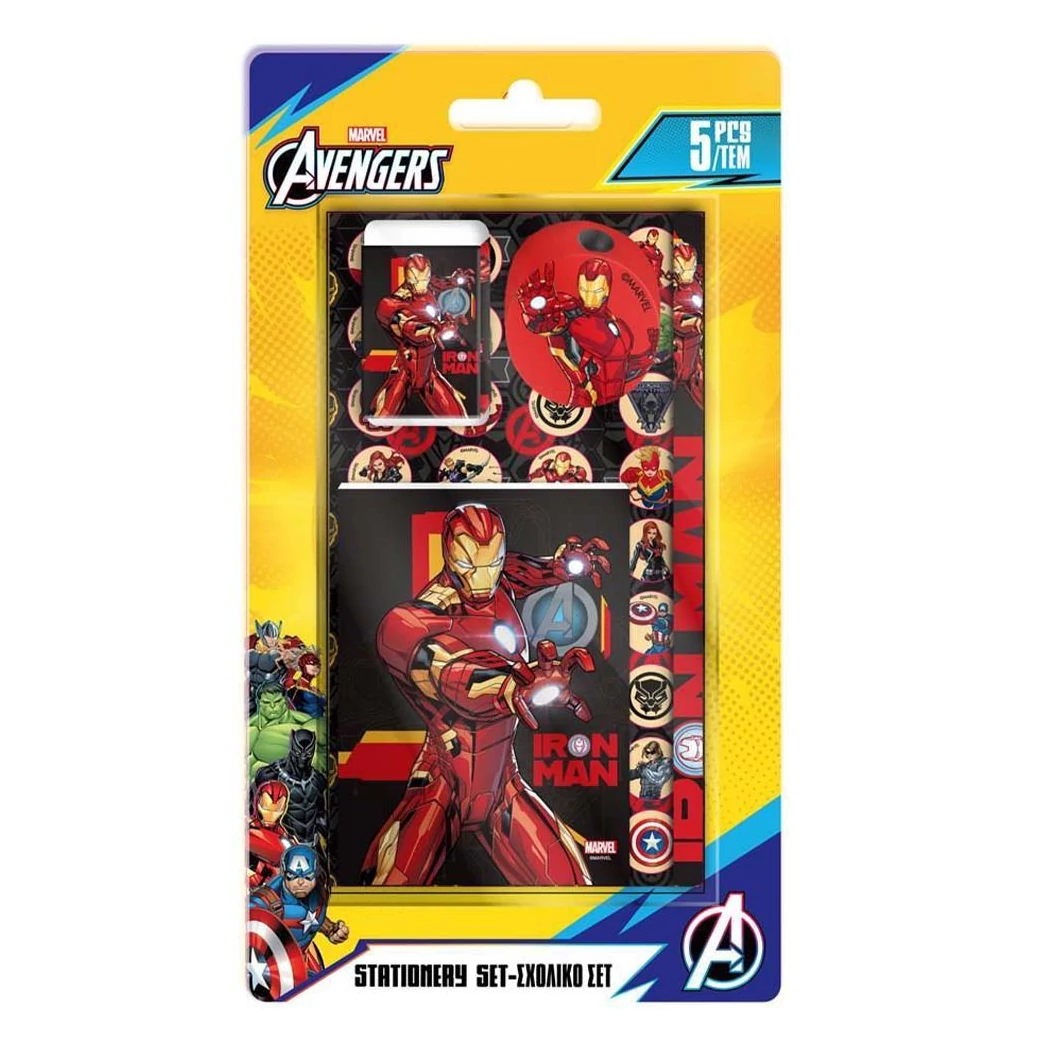 A szettben egy ceruza, egy hegyező, egy radír, egy vonalzó és egy kis notesz található, amelyek mindegyike látványos Iron Man grafikával van díszítve. A színvilágban dominál a piros, sárga és fekete, ami dinamikus és erőteljes megjelenést kölcsönöz az egész készletnek. A Marvel hivatalos dizájnja gondoskodik róla, hogy a minőség és a részletgazdagság is első osztályú legyen.