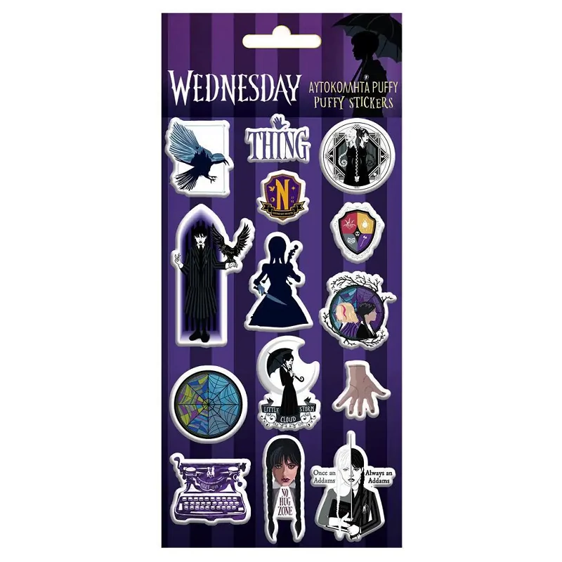 Varázsold még különlegesebbé a gyereked jegyzetfüzetét, iskolai felszerelését vagy akár a szobadekorációt ezzel a hátborzongatóan menő Wednesday pufi matrica szettel! A 10x22 cm-es íven többféle domború, puha tapintású matrica található, mind a népszerű Netflix sorozat, a Wednesday Addams világából merítve. A sötétlila háttér és az ikonikus figurák – mint Wednesday, a legendás „Thing” kéz, holló, esernyő és a misztikus motívumok – mind segítenek egyedi, vagány stílust kölcsönözni bárminek, amire felkerülnek.