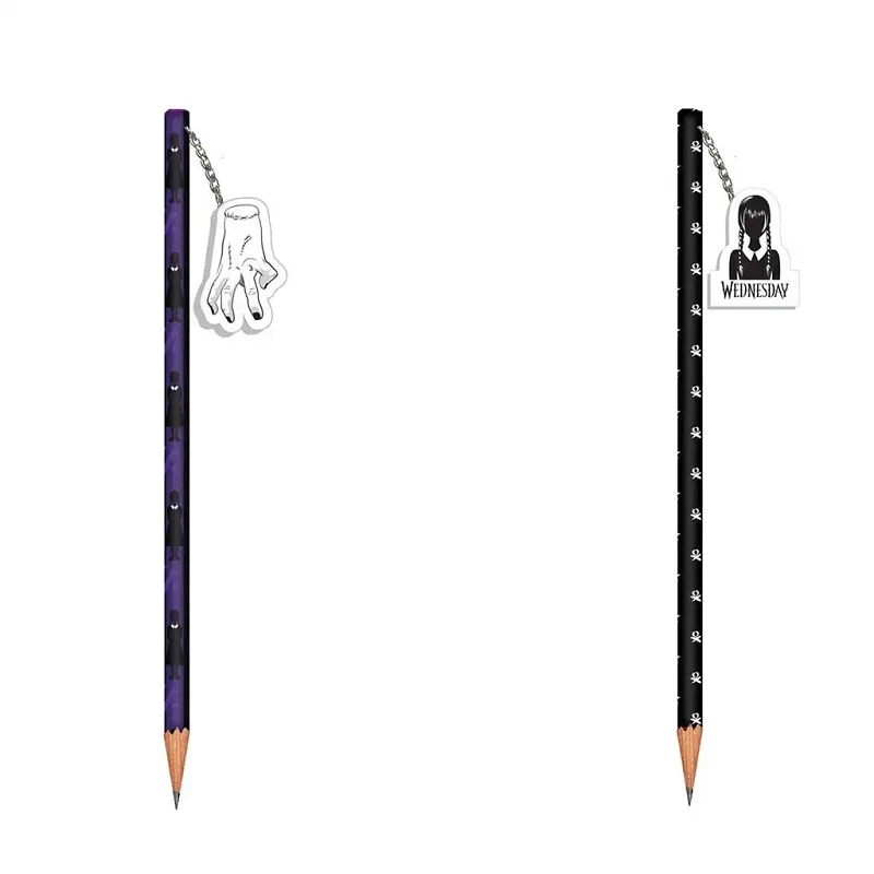 Lepd meg a Wednesday-rajongó gyermekedet egy igazán egyedi és vagány írószerrel! A Wednesday grafitceruza radírral nem csupán praktikus iskolai kiegészítő, hanem igazi stílusnyilatkozat is. Kétféle változatban kapható: az egyik ceruzát a titokzatos és ikonikus "Thing" (a kéz) díszíti, míg a másikon maga Wednesday Addams jelenik meg – természetesen a jól ismert komor stílusban, koponyás mintákkal körítve.