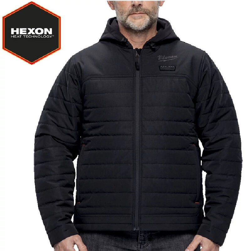 A Milwaukee M12 HPJBL3-0 (L) Fűthető pufi kapucnis kabát - HEXON - Fekete M12 FUEL™ akkumulátoros fűthető, könnyű pufidzsekis munkakabát (heated puffy jacket), kifejezetten hideg időjárású munkákhoz, építkezésre, kültéri szerelésre, faipari vagy téli kertészeti feladatokhoz tervezve.