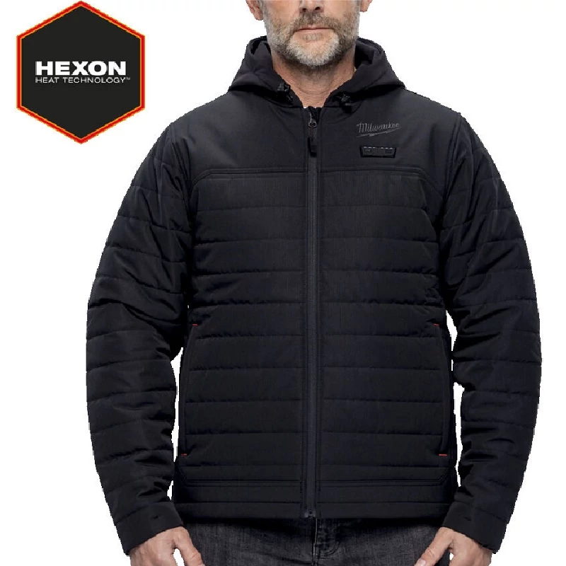 A Milwaukee M12 HPJBL3-0 (XL) Fűthető pufi kapucnis kabát - HEXON - Fekete M12 FUEL™ akkumulátoros fűthető, könnyű pufidzsekis munkakabát (heated puffy jacket), kifejezetten hideg időjárású munkákhoz, építkezésre, kültéri szerelésre, faipari vagy téli kertészeti feladatokhoz tervezve.