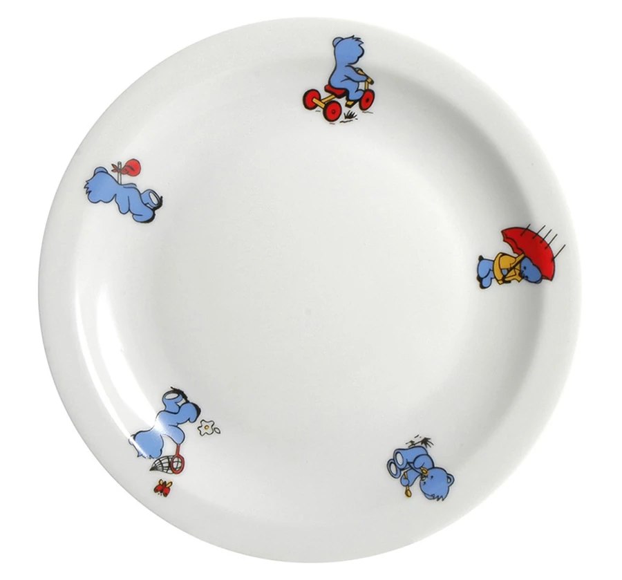 - Porcelán lapostányér 21 cm, gyermekeknek. A tányér szélén medvés díszítés található. Mosogatógépben mosható.
