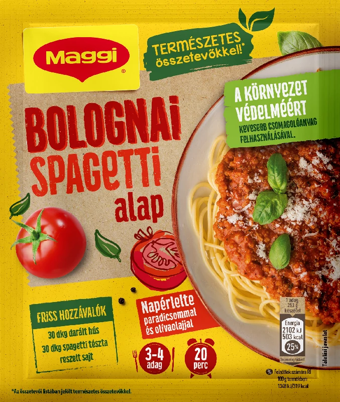 - Varázsold otthonodba az olaszos ízeket a megújult receptúrájú Maggi Bolognai Spagetti alap segítségével! A napérlelte zamatos paradicsomok, az olasz konyha által rendkívül kedvelt fokhagyma és vöröshagyma, valamint a változatos zöldfűszerek, mint az oregánó, a bazsalikom, a kakukkfű és a petrezselyem levesznek majd a lábadról. A hozzáadott olívaolaj teszi a terméket igazán különlegessé.